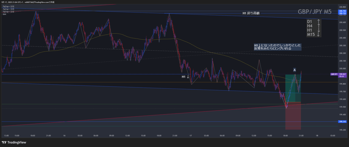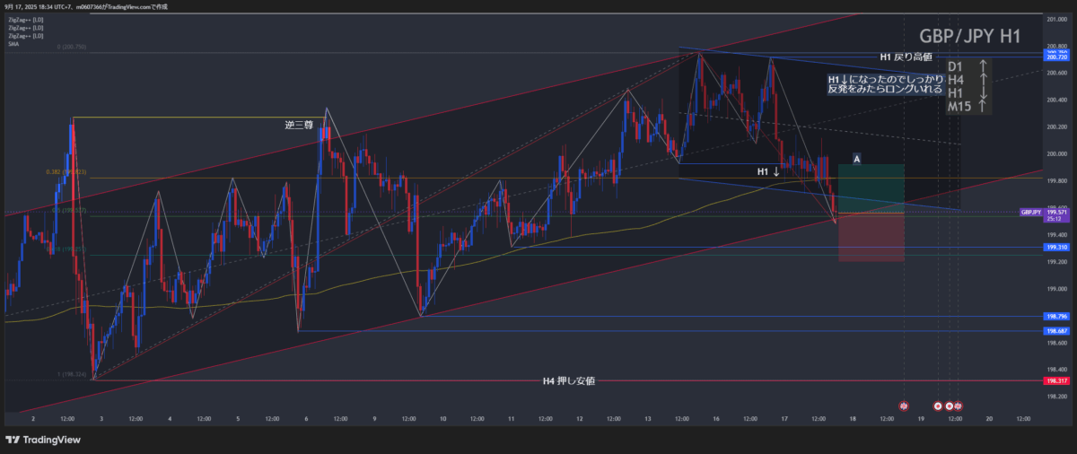 H4チャネルライン下限からロング。損切りは、0.618の↓にしてみた。