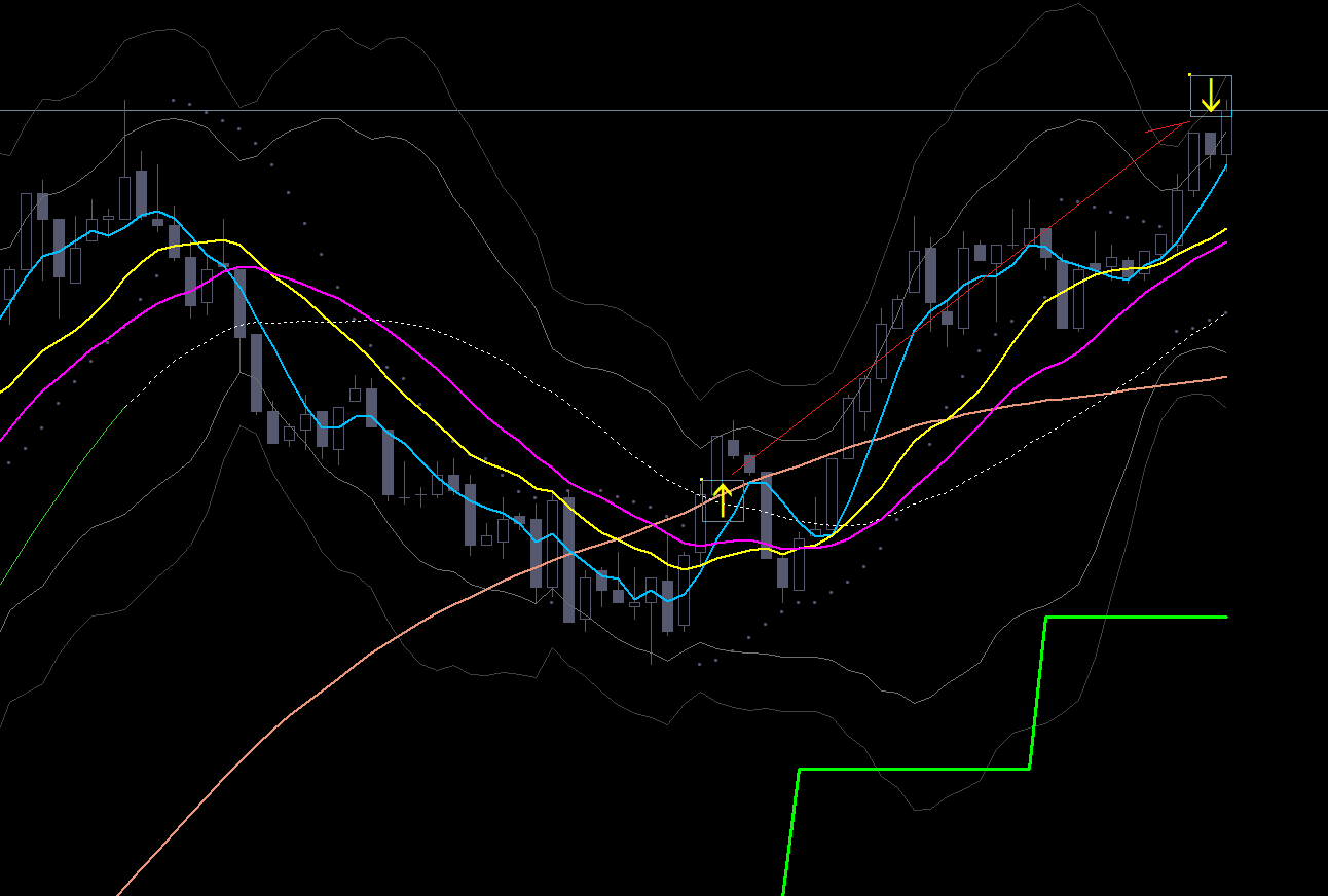 15分足の黄緑にタッチしていない。