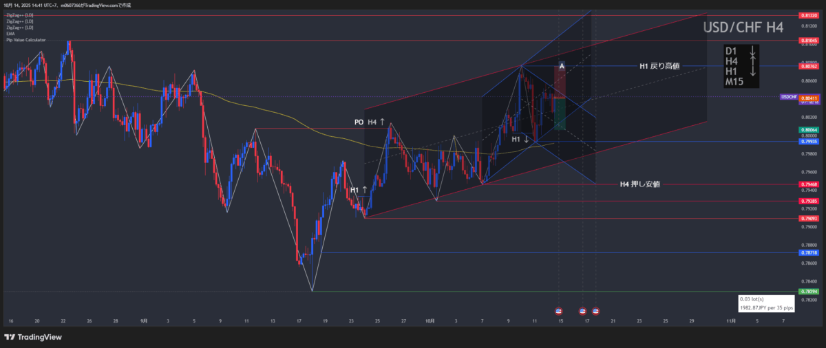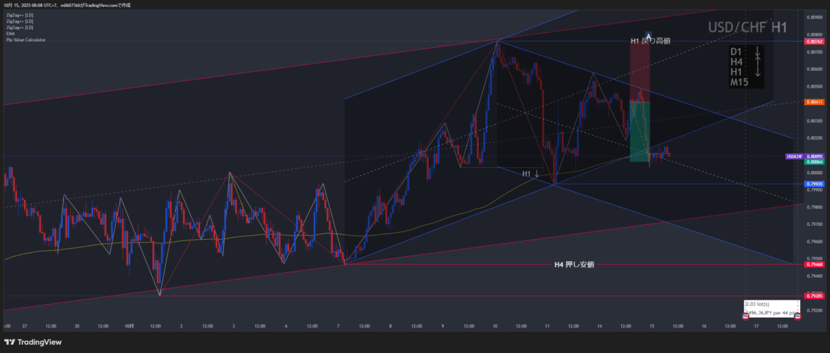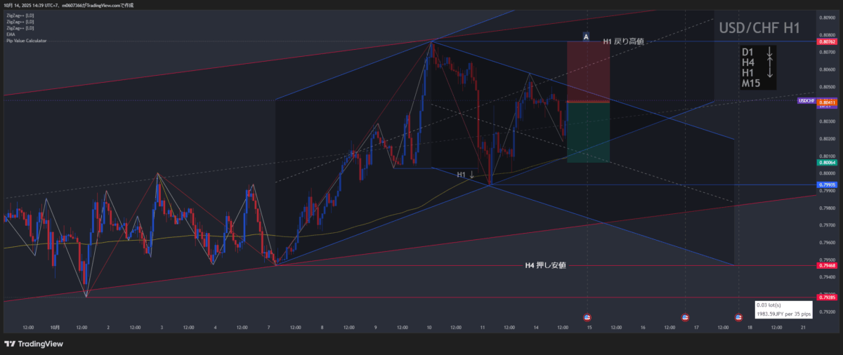 4時間足は上昇チャネルラインだが、上半分からのショート。H1は下降トレンドになっている。