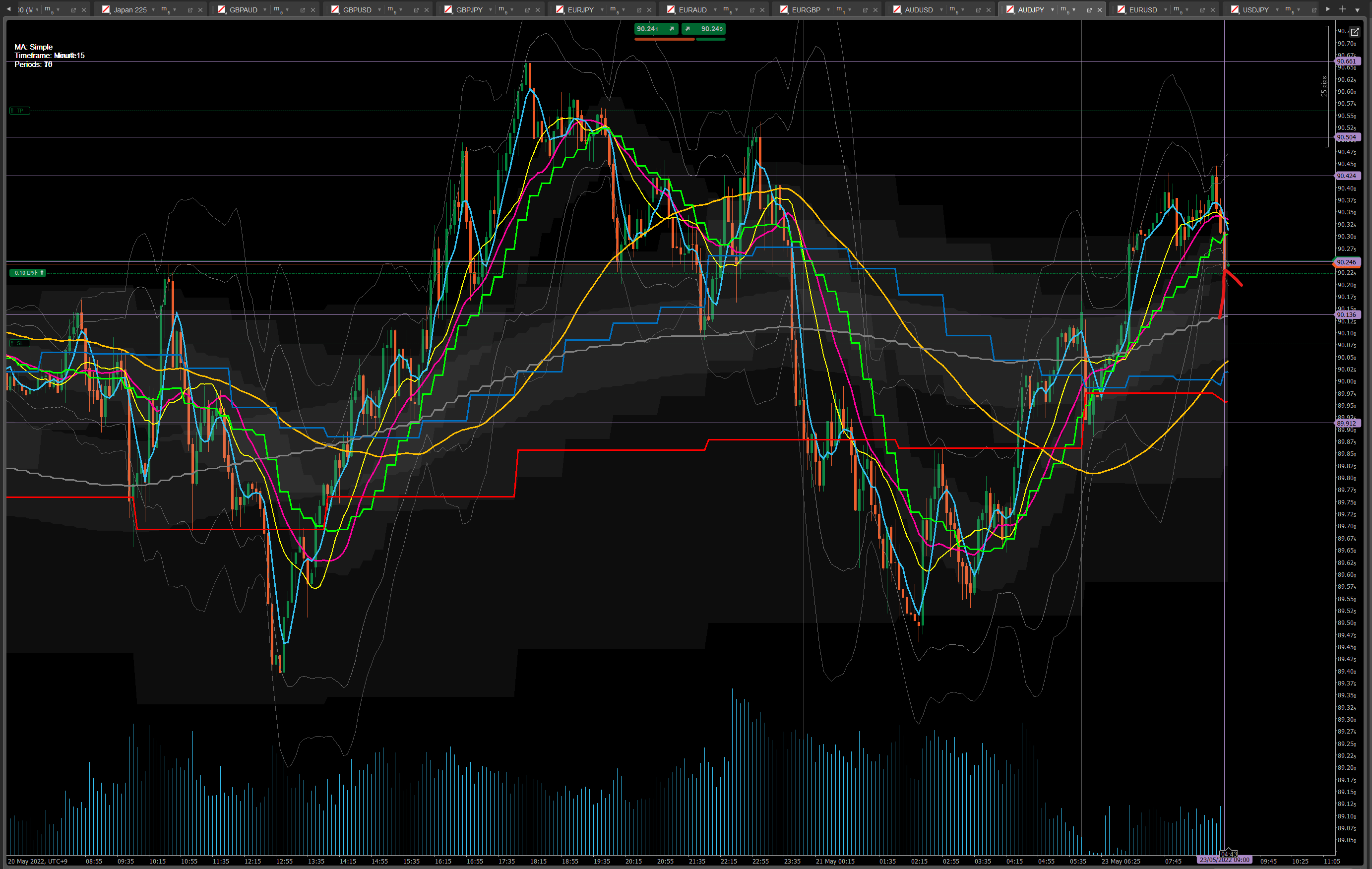 9時前からオージー円、オージードルが下がってきて、黄緑線にタッチしたので王道のエントリー。