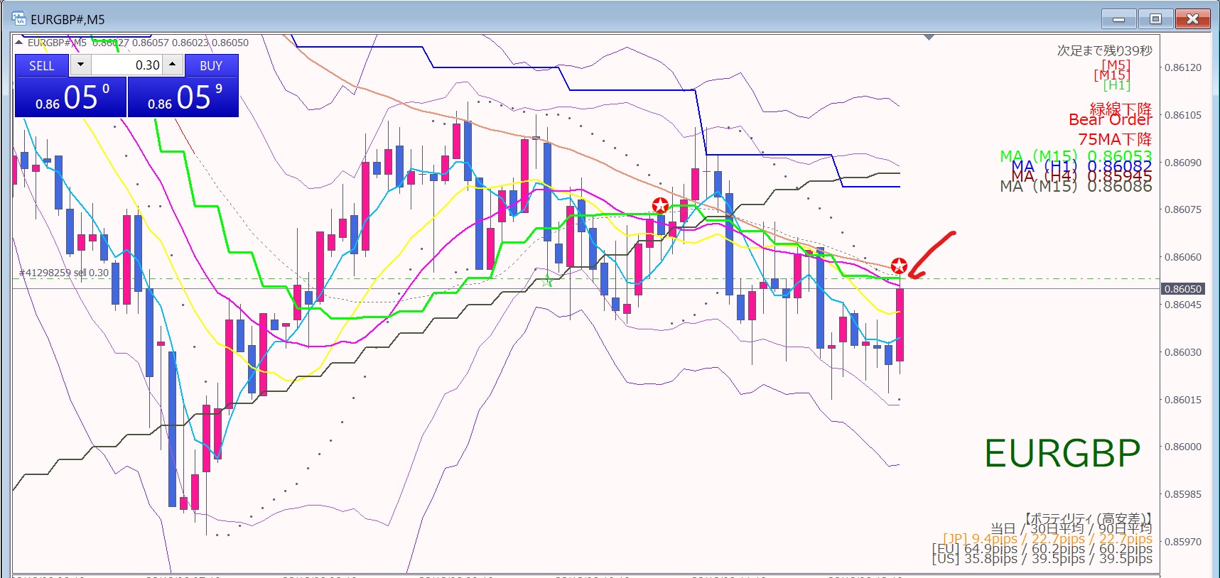 オージードルが三角持ち合いになっているので、そろそろ抜けると予想。しかし、だいたい、フェイントかけられることが多いので一度抜けて戻ってきたところをエントリー。