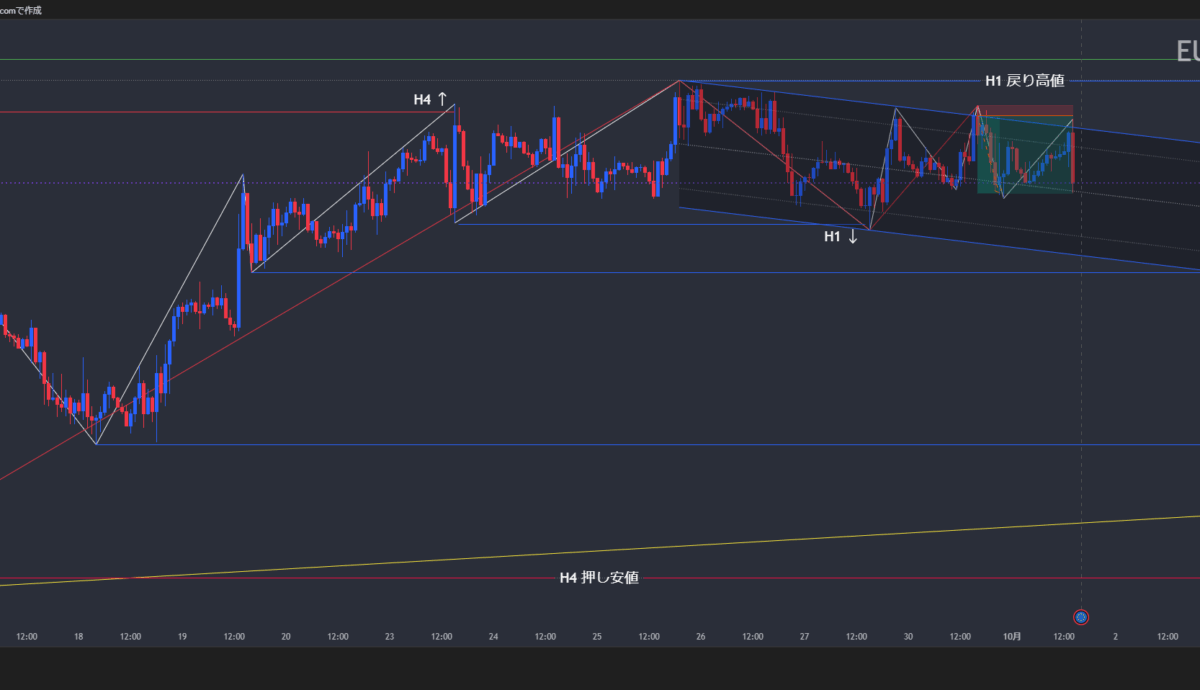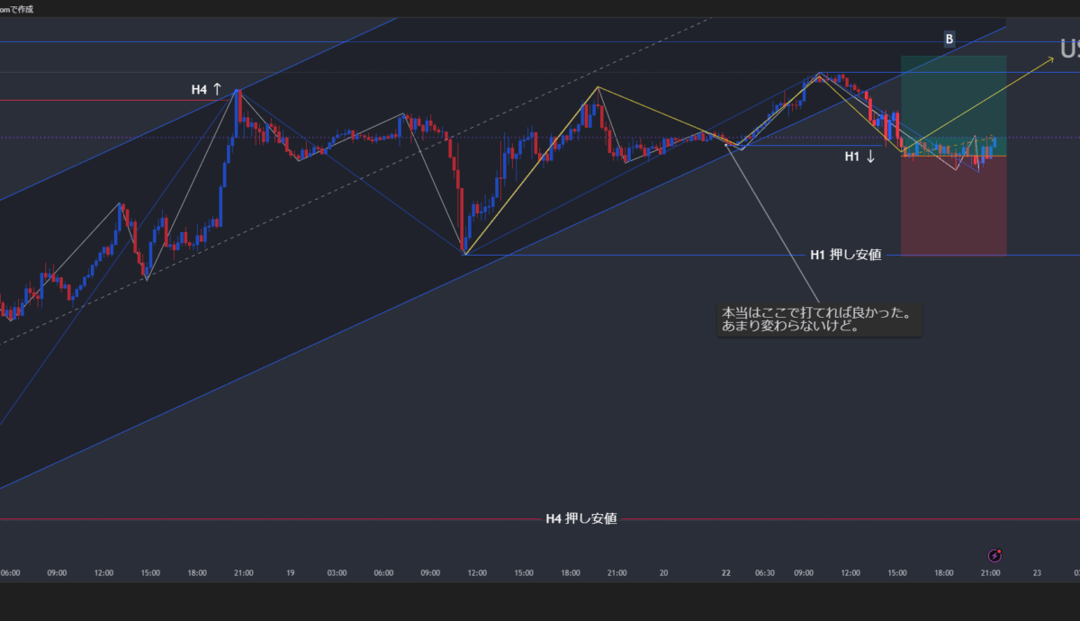 02.建値撤退 . 1.よすが式日足ラインにぶつかり、H1で転換したので、これば逆かと思い、下降チャネルライン上限からショート。 建値においたら引っかかってしまった。そのあとすぐに下がったのに。